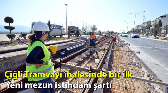 Yeni mezunlara büyük çaplı kamu projelerinde yer açmayı hedefleyen İzmir Büyükşehir Belediyesi bir ilke daha imza attı. Çiğli Tramvayı Yapım İhalesi ile Büyükşehir Belediyesi, yüklenici firmaya yeni mezun olmuş mühendis ve mimar çalıştırma zorunluluğu getirdi. Böylelikle Büyükşehir Belediyesi gençlere istihdam sağlamanın yanı sıra Türkiye’ye örnek de olacak.