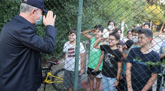 Çocukların verdiği asker selamına karşılık veren Bakan Akar daha sonra onların yanına gitti. Çocuklarla sohbet eden Bakan Akar, Korona virüs salgınından korunmak için maske takmaları, sosyal mesafe kuralına dikkat etmeleri ve ellerini yıkamaları uyarısında bulundu. Uzaktan eğitimin nasıl gittiğini soran Bakan Akar çocuklardan memnun oldukları yanıtını da aldı. Bakan Akar daha sonra Hava Kuvvetleri Komutanı Orgeneral Hasan Küçükakyüz'ü işaret ederek çocuklardan kim olduğunu bilmelerini istedi.
