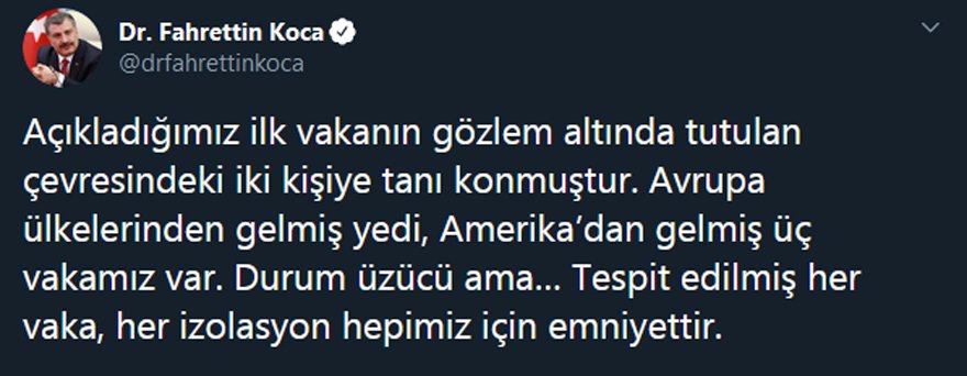 Açıkladığımız ilk vakanın gözlem altında tutulan çevresindeki iki kişiye tanı konmuştur. Avrupa ülkelerinden gelmiş yedi, Amerika'dan gelmiş üç vakamız var. Durum üzücü ama… Tespit edilmiş her vaka, her izolasyon hepimiz için emniyettir.