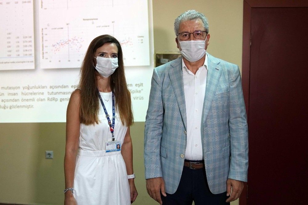 6 kıtada farklı ülkelerdeki hastalardan toplanan toplam 30 bin korona virüsü genom bilgisi üzerinde yaptıkları çalışmalar hakkında EÜ Rektörü Prof. Dr. Necdet Budak'a bilgi veren Doç. Dr. Karakülah, "İstatistik ve biyoinformatik analizlerimiz sonucunda; özellikle virüsün çoğalmasından sorumlu RdRp ile Nsp14 genlerindeki ve virüsün akciğerlere tutunmasından sorumlu Spike proteininde belirli mutasyonların olduğunu belirledik" diye konuştu.