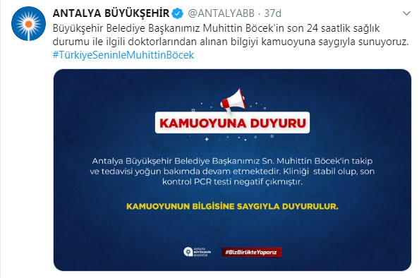 Antalya Büyükşehir Belediyesinin sosyal medya hesaplarından, hastanede yeni tip koronavirüs (Covid-19) tedavisi süren başkan Böcek'in son 24 saatlik sağlık durumuyla ilgili doktorlarından alınan bilgi paylaşıldı.Açıklamada, "Büyükşehir belediye Başkanı muhittin Böcek'in takip ve tedavisi yoğun bakımda devam etmektedir. Kliniği stabil olup, son kontrol PCR testi negatif çıkmıştır" ifadelerine yer verildi.
