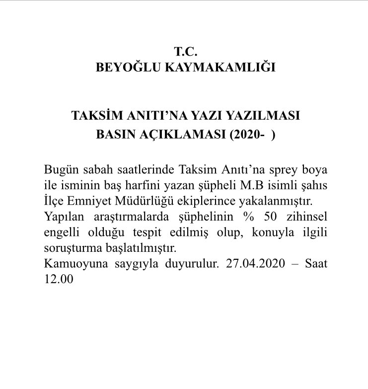 Beyoğlu Kaymakamlığı saldırıra ilişkin sosyal medya üzerinden açıklamada bulundu. Açıklamada anıta yazı yazan kişinin yüzde 50 engelli M.B isimli bir kişi olduğu ve yakalandığı ifade edildi.