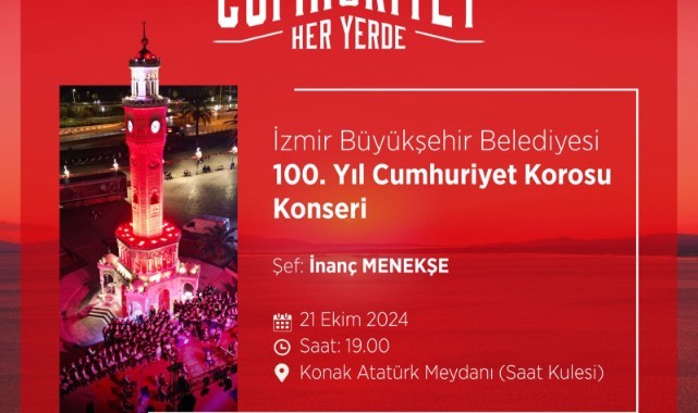 Cumhuriyet Bayramı’nın 101. yıl kutlamalarını büyük bir organizasyonla kent genelinde kutlayan İzmir Büyükşehir Belediyesi, “Cumhuriyet Her Yerde” programı kapsamında 21 Ekim günü Konak Atatürk Meydanı’nda konser düzenleyecek.