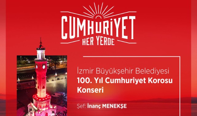 İzmir Büyükşehir Belediyesi 100. Yıl Cumhuriyet Korosu, Türk marşları ve Cumhuriyet dönemini yansıtan repertuvarı ile Cumhuriyet coşkusunu doruğa çıkaracak. İzmir Büyükşehir Belediyesi, 29 Ekim Cumhuriyet Bayramı kutlamalarını “Cumhuriyet Her Yerde” programı ile il geneline yayıyor. Bu kapsamda Konak Atatürk Meydanı, Kültür ve Sanat Dairesi Başkanlığı organizasyonunda önemli bir konsere ev sahipliği yapacak. İzmir Büyükşehir Belediyesi 100. Yıl Cumhuriyet Korosu, 100 kişilik koro üyesi ve 20 kişilik orkestrası ile 21 Ekim günü saat 19.00’da şef İnanç Menekşe yönetiminde sahneye çıkacak. Türk marşları ve Cumhuriyet dönemini yansıtan repertuvarın yer alacağı konserde, Cumhuriyet kazanımları vurgulanacak.