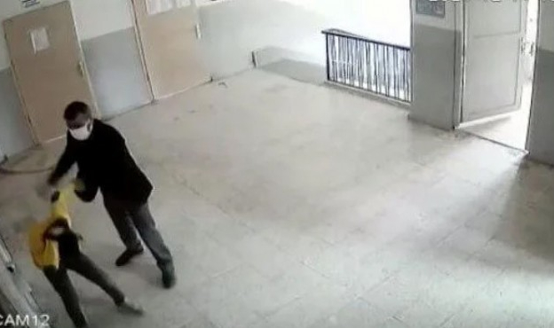 Görüntüler, Şehit Salih Aksu Ortaokulu'nda 14 Aralık'ta kaydedildi. Matematik öğretmeni Ali Rıza Y., koridora çıkardığı 5. sınıf öğrencisini dövdü.