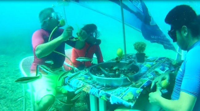İzmir Gümüldür'de bir dalış merkezinin ekibi, denizin altına masa ve şezlong kuruyor. Dalgıçlar, deniz altında midye ve mısır yedi. O anlar su altı kamerasıyla çekilirken, balıklarla bir arada keyif yapan dalgıçlar renkli görüntüler oluşturdu.Dalış merkezinin sahibi Murat Yaman, 'Dalış merkezi ekibi olarak değişik bir şey deneyelim dedik. Denizin altında her şey yapılabiliyor. Elemanların da hepsi midyeyi seviyor. Denizde beslenmek çok kolay. Bir zorluğu yok. Bazıları yurt dışına yemek yemeye gidiyor, biz de balıklarla baş başa deniz altında oturup yemek yiyoruz. Çok daha güzel oluyor. Bugün midyenin yanında mısır ve biber de yedik' dedi. Çalışanlar ise 'Denizin altında birçok şey yapıyoruz. Bazen çok sıcak olunca denizin altında şezlong kurup uzanıyoruz. Suyun altında sadece midye değil, çeşitli meyveler de yiyoruz, içecek de tüketiyoruz. Muhteşem bir deneyim oldu' diye konuştu. - İZMİR