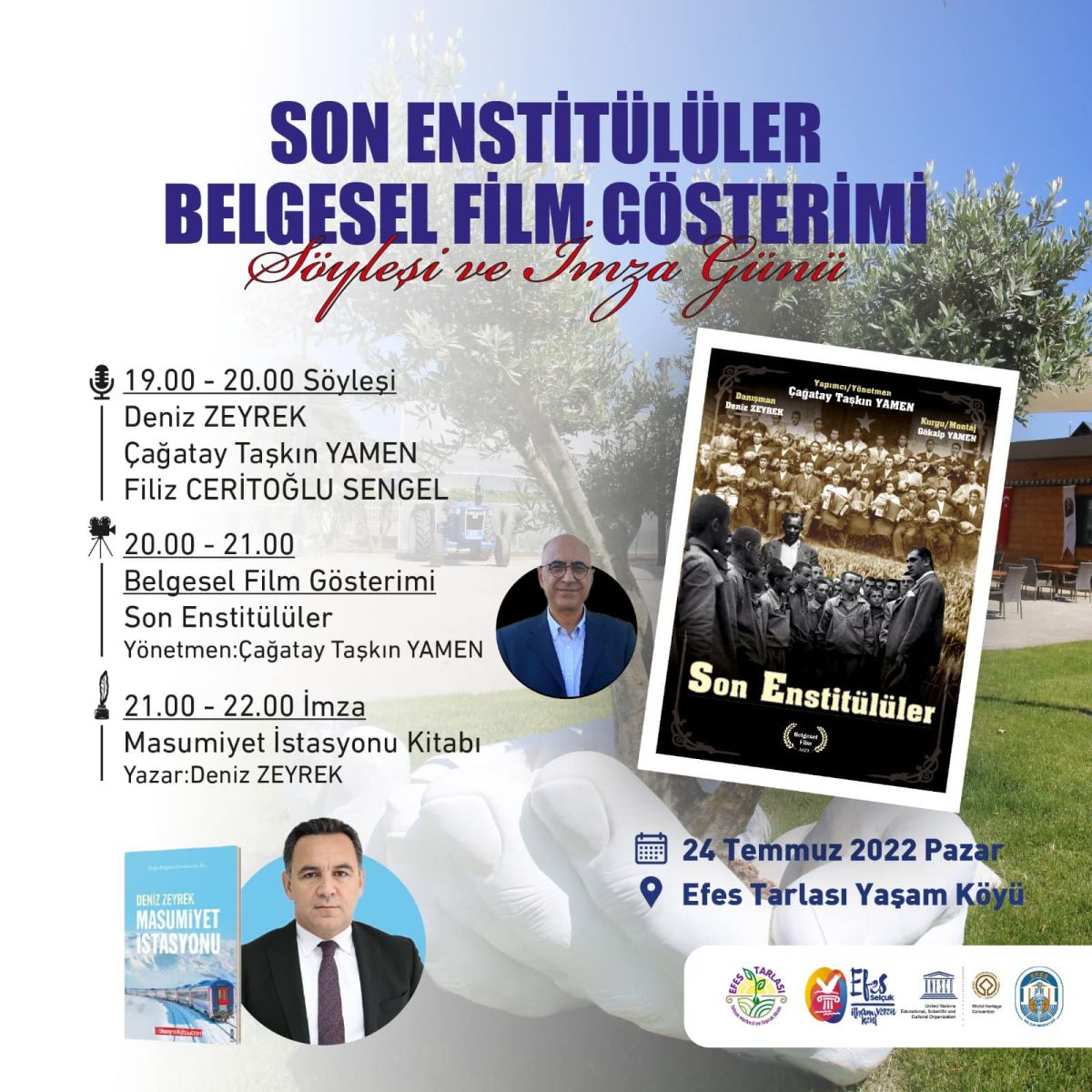 Efes Tarlası Yaşam Köyü önemli bir etkinliğe daha ev sahipliği yapıyor. Gazeteci Yazar Deniz Zeyrek, “Son Enstitülüler” belgesel filminin yönetmen ve yapımcısı Çağatay Taşkın Yamen’in ve efes selçuk Belediye Başkanı Filiz Ceritoğlu Sengel’in katılımlarıyla saat 19.00’da başlayacak söyleşinin devamında saat 20.00’de “Son Enstitülüler” belgesel filminin gösterimi gerçekleşecek. Kars Cilavuz Köy Enstitüsü mezunlarının yaşadığı anılardan yola çıkarak, köy enstitülerinin toplumsal işlev ve etkilerine vurgu yapan, 10 yıllık bir çalışmanın ürünü olan belgesel, Köy Enstitüleri’nden ilham alınarak hayata geçirilen Efes Tarlası Yaşam Köyü’nde seyirci ile buluşacak.Efes Tarlası Yaşam Köyü’nde gerçekleşecek etkinlik Gazeteci Yazar Deniz Zeyrek, çocukluk yıllarına ve Kars’a dair yazılarının yer aldığı Masumiyet İstasyonu adlı kitabını okurları için imzalayacak.