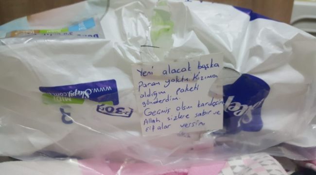 Poyracık ve Yayakent hizmet binalarında toplanan yardımlar, Kınık Belediyesi Halkla İlişkiler Müdürlüğü personeli tarafından düzenleniyordu. İsmi bilinmeyen bir vatandaş tarafından bırakılan yardım poşeti açıldığında, içerisinden çocuk giysileri ve açılmış çocuk bezi paketi çıktı. Personellerinden biri çocuk bezi üzerine iğnelenen yazıyı fark etti. "Yenisini alacak param yoktu. Kızıma aldığım paketi gönderdim, geçmiş olsun kardeşim. Allah sizlere sabır ve şifalar versin" şeklindeki yazıyı okuyanlar ise duygulandı.