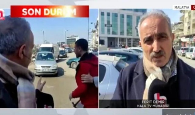 Kahramanmarai merkezli ve 11 ilde yıkıma neden olan deprem sonrası Malatya'da enkaz kaldırma çalışmalarını takip eden Halk TV ekibine saldırıda bulunuldu.Halk Tv'de Ayşenur Arslan'ın Medya Mahallesi programına canlı bağlanan Ferit Demir çekiçli bir saldırgan tarafından tehdit edildi. Canlı yayında olaya tanık olan Ayşenur Aslan "İhbar ediyorum! Ne adına, kim adına" dedi.'Çekiç alarak yanımıza geldi. 'Hepinizi öldürürüm, gebertirim' diye tehditlerde bulundu'Ferit Demir o anları şöyle anlattı:"Daha önce de bu enkazın önünde birçok yayın yapmıştık. Valiliğin açıklamasını okuyacaktım. Malatya'da 14 bin çadır dağıtıldığını, merkezde 3 bin çadır kurulduğunu, 20 bin vatandaşın barındığını, 45 ayrı noktada yemek dağıtıldığını anlatıyordum.Tam o sırada kamyonetle geçen bir vatandaş camını indirerek 'Yalan söylüyorsunuz, devlet burada var' diye bağırmaya başladı. Çekiç alarak yanımıza geldi. Hepinizi öldürürüm, gebertirim' diye tehditlerde bulundu. Oradan geçen iki vatandaş doğruları anlatıyor' dedi. Onları da tehdit etti, sizi de öldürürüm dedi. Uzun süre sizi öldürürüm, vururum, hükümete bir şey söylemeyeceksiniz' diye tehditlerde bulundu. Elinde çekiç de vardı. Sonra iki polis memuru geldi, şikayetçi olduğumuzu söyledik ama herhangi bir işlem yapmadı. Size vurmadığı için, kafanıza vurmadığı için işlem yapamam.Belki bir sıkıntısı vardır gergindir dediler. Yelekleri üstündeydi. Israrla şikayetçi olduğumuzu söyledik, çekiçle size vurmadığı için işlem yapamayız dedi."Halk TV muhabiri Ferit Demir, 10 Şubat'ta Malatya Battalgazi'deki arama kurtarma çalışmalarını takip ederken de saldırıya uğramıştı.