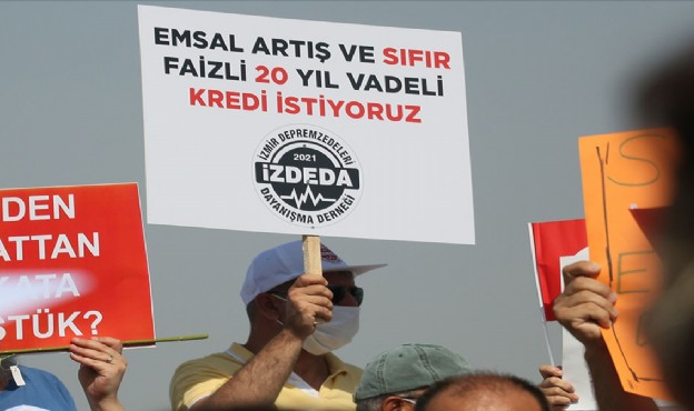 İzmir Depremzedeleri Dayanışma Derneği (İZDEDA) üyeleri, Gündoğdu Meydanı'nda bir araya geldi. Burada ellerindeki pankartlarla sloganlar atan üyeler, depremzedelerin yaralarının sarılamadığını öne sürerek, emsal artışı ve sıfır faizli kredi talebinde bulundu.