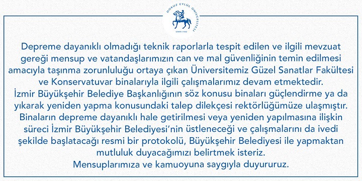İzmir Büyükşehir Belediye Başkanı Tunç Soyer, dokuz eylül Üniversitesi Güzel Sanatlar Fakültesi'nin Tınaztepe'ye taşınmaması için kendisinden destek isteyen öğrenciler adına umut veren bir girişimde bulunmuş, Soyer, üniversite rektörlüğüne gönderdiği yazıyla, taşınması planlanan fakültenin bugünkü binasını sağlamlaştırmak için her türlü desteğe hazır olduklarını söylemişti.Soyer’in üniversiteye yönelik adımı sonrası, Dokuz Eylül Üniversitesi’nden konuyla ilgili açıklama geldi. Yapılan açıklamada, “Binaların depreme dayanıklı hale getirilmesi veya yeniden yapılmasına ilişkin süreci İzmir Büyükşehir Belediyesi’nin üstleneceği ve çalışmalarını da ivedi şekilde başlatacağı resmi protokolü Büyükşehir Belediye ile yapmaktan mutluluk duyacağız” ifadeleri yer aldı.Açıklama şu şekilde;