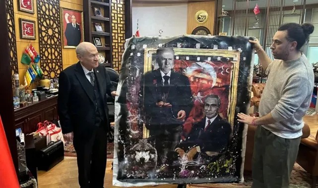 Mililyetçi Hareket Partisi (MHP) Genel Başkanı Devlet Bahçeli, ressam Ersan Kay'ı kabul etti. Ersan Kay, Bahçeli'nin sprey boya ile yaptığı 2 tablosunu kendisine hediye etti.