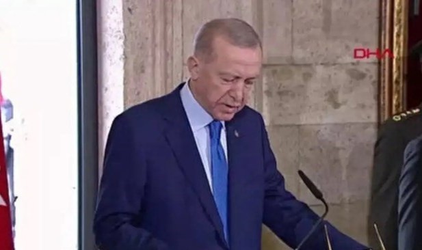 Erdoğan, Atatürk'ün mozolesine ay yıldız motifli çelengi bıraktı. Saygı duruşunun ardından İstiklal Marşı okundu.