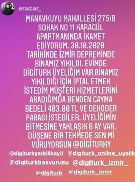 “Manavkuyu Mahallesi 275/8 Sokak No:11 Karagül Apartmanı’nda ikamet ediyorum. 30.10.2020 tarihinde İzmir Depremi’nde binamız yıkıldı. Evimde Digiturk üyeliğim var.
