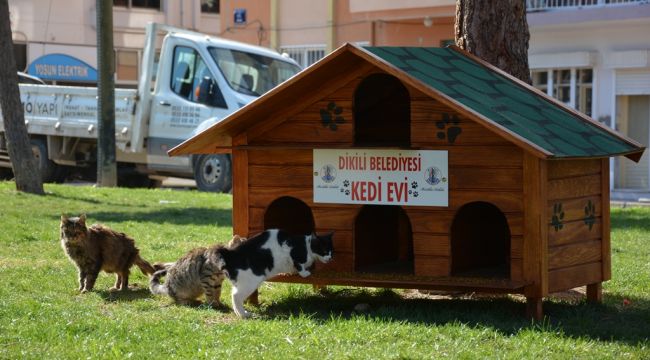 Dikili Belediyesi tarafından sokakta yaşayan kediler için kedi evleri yapılarak ilçenin her noktasına yerleştiriliyor. Mama ve su kapları ile birlikte yerleştirilen kedi evleri daha korunaklı olması için ekstra çam ağacından yapılıyor. Can dostlar için düzenli olarak mama ve su desteği de belediyemiz tarafından karşılanıyor.