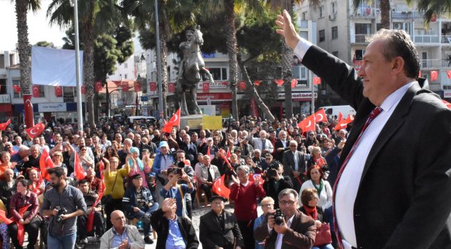 31 Mart 2019 yerel seçimi için Cumhuriyet Halk Partisi’nden yeniden Dikili Belediye Başkan Aday Adaylığı başvurusunu gerçekleştiren mevcut başkan Mustafa Tosun, Dikili Atatürk Meydanı’nda düzenlediği açık hava toplantısında 4,5 yılı aşan görev süresinde gerçekleştirdiği yatırım ve projelerini tek tek anlattı. Tosun, “Dikili halkı için yürüyecek daha çok yolumuz var” diyerek yeniden er meydanına çıktığını, er meydanına çıkan diğer aday adaylarına da başarı dilediği ifade etti. chp Dikili İlçe Başkanı Hasan Altıparmak’la ilçe binasından yürüyerek birlikte geldiği toplantıda konuşan CHP’li Tosun, kentine ve kentlisine hizmet üretmek için taşın altına gövdesini koymaya hazır olduğunu belirtti. Başkan Tosun, “4,5 yılı aşan görev süremde hep ‘önce Dikili, önce Dikilili vatandaşlarımız’ diyerek hizmet ürettik. Yeni dönemde de ilçemizin gelişimi, değişimi ve hemşerilerinin huzuru, refahı için görev almaya hazırım” dedi.