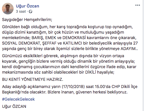 Saygıdeğer Hemşehrilerim;Gönülden bağlı olduğum, her karış toprağında koşturup top oynadığım, düşüp dizimi kanattığım, bir çok hüzün ve mutluluğumu yaşadığım memleketimde; BARIŞ, EMEK ve DEMOKRASİ kavramlarını öne çıkararak, SOSYAL DEMOKRAT, ŞEFFAF ve KATILIMCI bir belediyecilik anlayışıyla 27 yaşında genç bir birey olarak ilçemizi sizlerle birlikte yönetmeye ADAYIM..Günümüzü eksiklikleri görerek, alışılmışın dışında bir vizyon ortaya koyarak, gençliğin bizlere vermiş olduğu dinamik bir yönetim anlayışıyla; kendi doğmamış çocuklarımızın dahi kendilerini özgürce ifade edip, karar mekanizmasında söz sahibi olabilecekleri bir DİKİLİ hayaliyle;BU KENTİ YÖNETMEYE HAZIRIZ.Aday adaylığı açıklamamız yarın (17/10/2018) saat 15.00'da CHP Dikili İlçe Başkanlığı'nda olacaktır. Bizlere inanan, güvenen herkesi bekliyoruz.