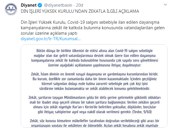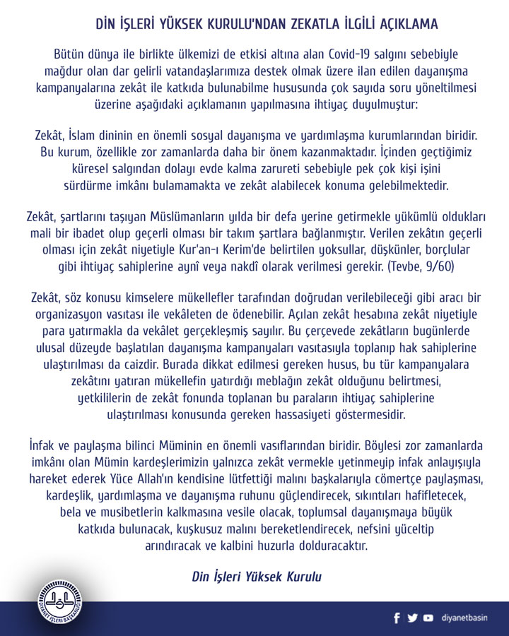 *Bütün dünya ile birlikte ülkemizi de etkisi altına alan Covid-19 salgını sebebiyle mağdur olan dar gelirli vatandaşlarımıza destek olmak üzere ilan edilen dayanışma kampanyalarına zekât ile katkıda bulunabilme hususunda çok sayıda soru yöneltilmesi üzerine aşağıdaki açıklamanın yapılmasına ihtiyaç duyulmuştur: