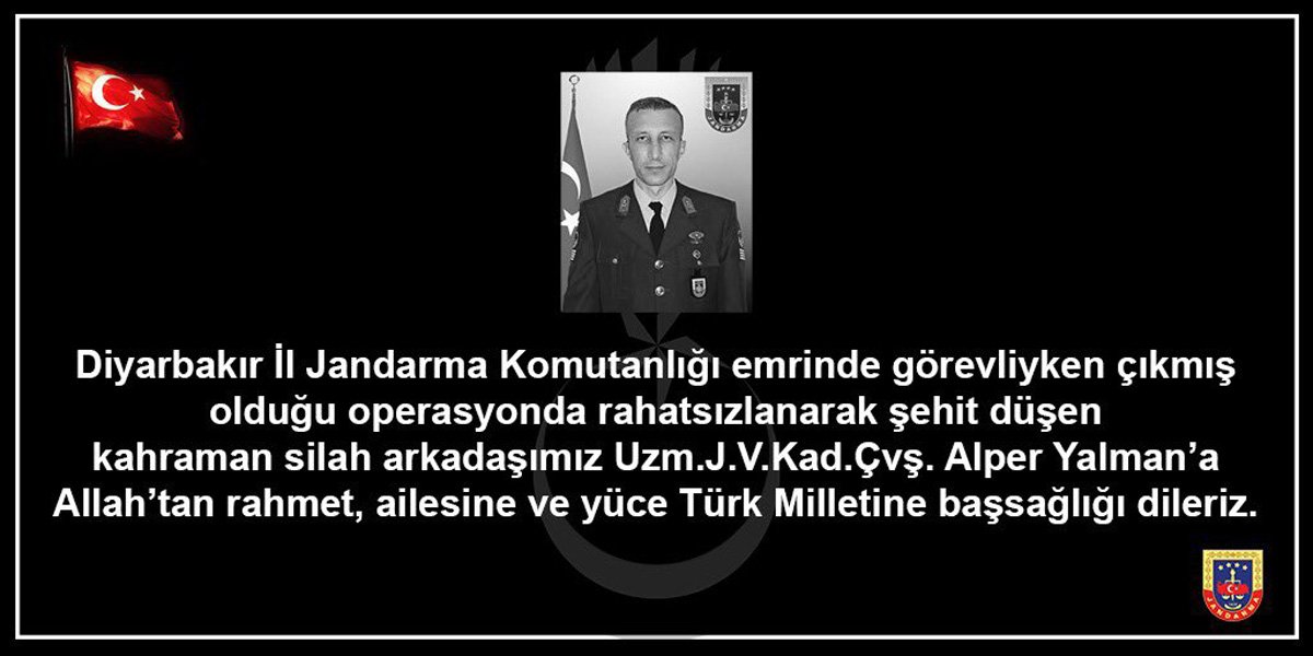 - diyarbakır İl Jandarma Komutanlığı emrinde görevliyken çıkmış olduğu operasyonda rahatsızlanarak şehit düşen kahraman silah arkadaşmız Uzman Jandarma Çavuş Alper Yalman’a Allah’tan rahmet, ailesine ve yüce Türk milletine başsağlığı dileriz.”