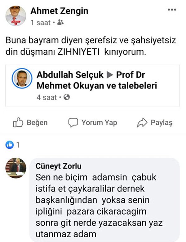 Sosyal medya hesabından “Buna bayram diyen şerefsiz ve şahsiyetsizdir, din düşmanı zihniyeti kınıyorum” ifadelerini kullanan Zengin büyük tepki çekti. Ortahisar Belediyesi CHP’li Meclis Üyesi Cüneyt Zorlu da doktorun yaptığı paylaşım altına, “Sen ne biçim adamsın, çabuk istifa et Çaykaralılar dernek başkanlığından. Yoksa senin ipliğini pazara çıkaracağım. Sonra git nerede yazarsan yaz utanmaz adam” diye yazdı.