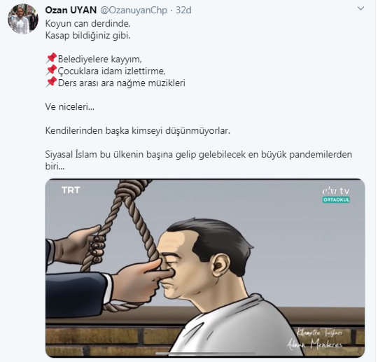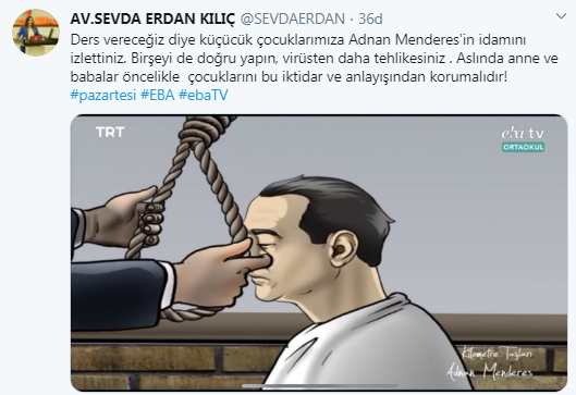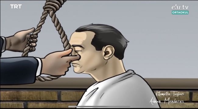 EBA TV’nin ortaokul kanalında ise dersin başlamasına 5 dakika kala çocuklara Adnan Menderes belgeseli izletildi. Belgeselde, Adnan Menderes’in idam sahneleri de gösterildi.