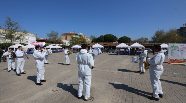 Efes Selçuk Belediye Bandosu belediye hizmet binası önünden başlayarak kentin sokaklarını müziğin neşesiyle doldurdu. Bando takımı; hastane önünde sağlık çalışanlarına moral verirken, Efes Selçuk Halk Pazarı’nda alış veriş yapan vatandaşlar da müzik ziyafetine ortak oldu. Ülkenin içinde bulunduğu bu zor günlerde kentin sokaklarında moral dağıtan ve büyük beğeni toplayan bando ekibine sağlık çalışanlarının yanı sıra vatandaşlar da evlerinin balkonlarından alkışlarla eşlik ettiler.