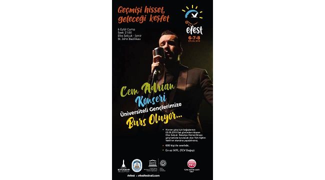 6 Eylül akşamı saat 21.00’de Cem Adrian'ı St. John Bazilikası’nda müzikseverlerle buluşturacak konserin tüm geliri, Türkiye Eğitim Vakfı’na (TEV) bağışlanacak. Konser davetiyelerinin eğitim için çalışan bir vakfa yapılan bağışlarla temin edilmesinin çok daha anlamlı olduğuna dikkat çeken Efes Selçuk Belediye Başkanı Filiz Ceritoğlu Sengel; "Eğitime destek veren tüm müzikseverlere şimdiden çok teşekkür ediyorum" dedi.