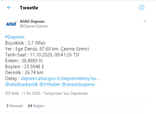 Gündem 11 Ekim 2020 - 09:42 Ege Denizi açıklarında deprem Ege Denizi'nde İzmir'in Çeşme ilçesi açıklarında 3.7 büyüklüğünde bir deprem meydana geldi. Gündem 11 Ekim 2020 - 09:42 Yorumlar TAKİP ET Dinle Yazdır A Büyüt A Küçült Yorumlar AFAD'ın yaptığı açıklamaya göre, ege Denizi'nde İzmir'in Çeşme ilçesi açıklarında 3.7 büyüklüğünde bir deprem meydana geldi.Deprem 26.74 kilometre derinlikte meydana geldi. # izmir# ege# denizi# deprem# sarsıntı YORUMLAR adlı kullanıcıya cevap x Gönder İlginizi Çekebilir İZBETON soruşturmasında villa detayı! Şikayet dilekçesi ortaya çıktı Bornova Belediye Başkanı Eşki'nin serbest bırakılmasına savcılıktan itiraz Başkan Eşki'nin ifadesi ortaya çıktı! Mahkemeden Meslek Fabrikası için kritik karar: Delil tespiti kısmen kabul edildi, Cemil Tugay fabrikaya girdi Son Haberler Folkart Academy, İkinci Dönem Mezunlarını Verdi Gaziemir’den okul saldırılarına tepki Gaziemir’den okul saldırılarına tepki Gülistan Doku soruşturması: Eski Tunceli Valisi Sonel açığa alındı Dolar ve Enflasyon Beklentisi Yükseldi, Büyüme Frenledi: İşte Merkez... Ermenistan'dan ateşkes ihlali: 6 ölü, 28 yaralı Ermenistan'dan ateşkes ihlali: 6 ölü, 28 yaralı
