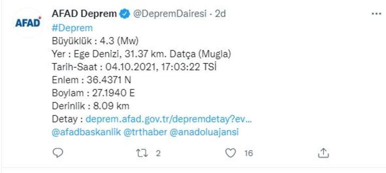 Çevre 04 Ekim 2021 - 17:09 Ege Denizi'nde korkutan deprem AFAD'dan yapılan açıklamaya göre Ege Denizi'nde 4.3 büyüklüğünde bir deprem meydana geldi. Depremin derinliğinin 8 km olduğu bildirildi. Çevre 04 Ekim 2021 - 17:09 Yorumlar TAKİP ET Dinle Yazdır A Büyüt A Küçült Yorumlar Ege Denizi'nde 17.03'te 4.3 büyüklüğünde bir deprem oldu. AFAD'dan yapılan açıklamada depremin datça açıklarında ve 10 km derinlikte olduğu belirtildi. # deprem# afad# datça# ege denizi YORUMLAR adlı kullanıcıya cevap x Gönder İlginizi Çekebilir Yaz Erkenden Geliyor: Baharda Sıcaklıklar Rekor Kıracak İşte İzmir'in barajlarında güncel durum! İzmir'de yağışlara 3 gün mola! Yalancı Bahara Aldanmayın: Sağanak ve Fırtına Kapıda Son Haberler Seferihisar'ın "Sakin Şehir" vizyonu Ege'ye örnek oldu Manisa Festivale Hazırlanıyor Gaziemir’in çınarlarından fidanlara 23 Nisan armağanı Buca’da Atatürk hayranı bir İspanyol Yabancı mimarlar Karşıyaka’yı anlattı İnşaat işçisi 10'uncu kattan düşüp öldü İnşaat işçisi 10'uncu kattan düşüp öldü