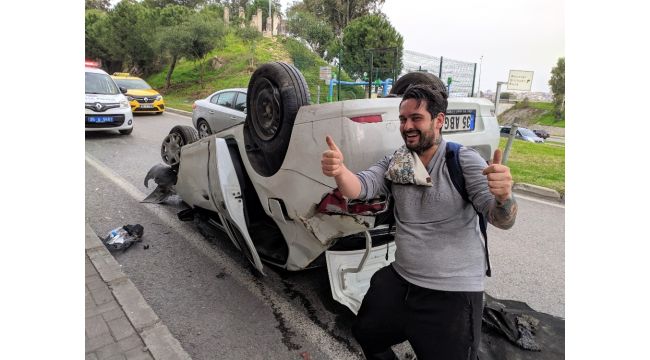 İzmir'de makas attıktan sonra hızlanan ehliyetsiz sürücü, virajı alamayarak takla attı. Hastaneye gitmeyi kabul etmeyen sürücü, kaza yerinde kaybolan telefonunun derdine düştü.