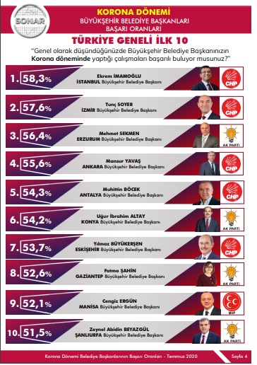 Türkiye’de görülmeye başlanan koronavirüs salgını ile birlikte yerel yönetimlere büyük bir görev düşmüştü. Özellikle pandemi sürecinde işsiz kalan ve sokağa çıkmak zorunda olan vatandaşlar gıda ve maske-dezenfektan gibi yardımlar beklerken, Cumhuriyet Halk Partili belediyeler gösterdikleri performans ile pandemiye damga vurmuştu. Özellikle Türkiye’nin en büyük üçüncü kenti olan İzmir’de İzmir Büyükşehir Belediye Başkanı tunç soyer pandeminin ilk gününden itibaren ortaya koyduğu başarılı çalışmalar ile İzmirli vatandaşların takdirini kazandı. Gerek gıda paketi yardımı gerekse sağlık çalışanlarına karşı gösterdiği ilgi sonrası Başkan Soyer’in yükselişi anketlere de yansıdı. Sonar Araştırma Şirketi tarafından yapılan “En başarılı Büyükşehir Belediye Başkanları” anketinde İzmir Büyükşehir Belediye Başkanı Tunç Soyer yüzde 57,6 ile en başarılar sıralamasında ikinci sırayı aldı. Araştırmada ilk sırada ise yüzde 58,3'lük puan ile İstanbul Büyükşehir Belediye Başkanu Ekrem İmamoğlu yer aldı.