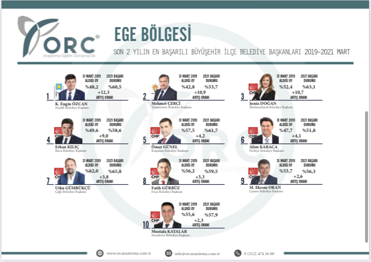 İZMİR GÜNDEMİ Orc Araştırma Şirketi’nin ‘Yerel yönetimler performans araştırması’ başlığıyla yaptığı anket çalışmasının sonuçları belli oldu. son 2 yılın en başarılı belediye başkanlarının belirlendi ankete İzmir’in CHP’li başkanları damga vurdu. 27 bin 160 kişiyle yüz yüze yapılan araştırma sonucunda en başarılı belediye başkanları belirlendi. Ege Bölgesi’nde yapılan ankette ilk sırayı İYİ Partili Engin Özcan alırken listeye İzmir’in CHP’li başkanları damgayı vurdu. İlk 10’da 5 belediye başkanı yer aldı.