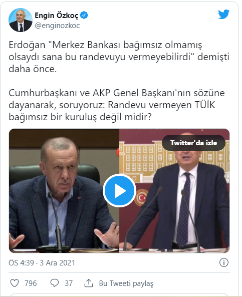 TÜİK BAĞIMSIZ BİR KURULUŞ DEĞİL MİDİR?'CHP Grup Başkanvekili Engin Özkoç, AKP'li Cumhurbaşkanı Tayyip Erdoğan'ın, "Merkez Bankası bağımsız olmamış olsaydı sana bu randevuyu vermeyebilirdi "sözlerini hatırlatarak gelişmelere tepki gösterdi.Özkoç, "Cumhurbaşkanı ve AKP Genel Başkanı'nın sözüne dayanarak, soruyoruz: Randevu vermeyen TÜİK bağımsız bir kuruluş değil midir?" diye sordu.