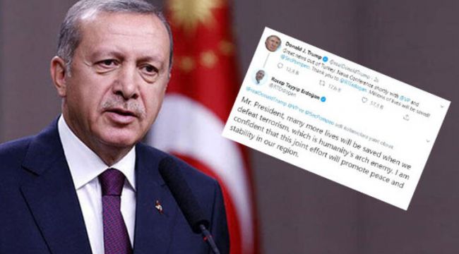 Cumhurbaşkanı Recep Tayyip Erdoğan ABD Başkanı Donald Trump'a Twitter üzerinden "Terörü yendiğimizde daha fazla hayat kurtulacak" ifadeleriyle cevap verdi. Trump, Erdoğan ve ABD Başkan Yardımcısı Mike Pence görüşmesinin ardından, "Türkiye'den harika haberler var. Teşekkürler Cumhurbaşkanı Erdoğan. Milyonlarca hayat kurtulacak" diye yazmıştı..