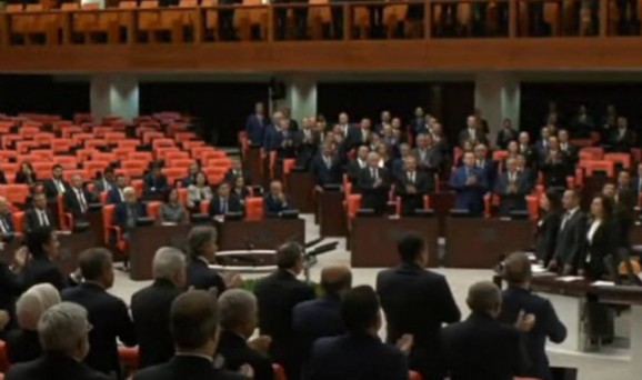 Cumhurbaşkanı Erdoğan, Meclis'te yemin ederek 2028'e kadar sürecek olan görevine başladı.Erdoğan, yemin töreninde metni okurken Yeşil Sol Parti ve CHP milletvekilleri, Erdoğan'ı protesto ederek ayağa kalkmadı. Ailesi, kabine üyeleri, AK Parti ve MHP'li vekiller Erdoğan'ı ayakta alkışladı.Muhalefet parti milletvekilleri, dün yemin etmek için Meclis'e gelen Cumhurbaşkanı Recep Tayyip Erdoğan'ı ayağa kalkmayarak protesto etmişti. (T24)