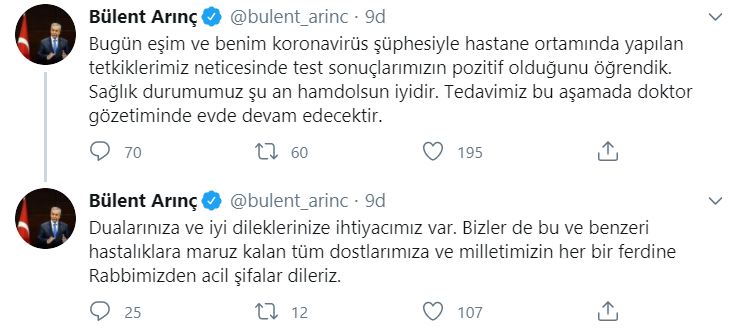 "Bugün eşim ve benim koronavirüs şüphesiyle hastane ortamında yapılan tetkiklerimiz neticesinde test sonuçlarımızın pozitif olduğunu öğrendik. Sağlık durumumuz şu an hamdolsun iyidir. Tedavimiz bu aşamada doktor gözetiminde evde devam edecektir.