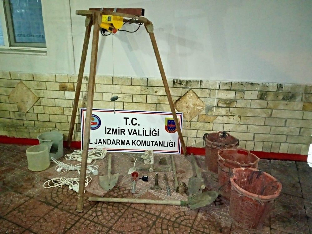 İzmir İl Jandarma Komutanlığına bağlı Bergama İlçe Jandarma Komutanlığı ekipleri, Zeytindağ Mahallesi'nde bulunan bir evin içerisinde kaçak kazı yapıldığı istihbaratını alarak belirlenen adrese operasyon düzenledi. Düzenlenen operasyonda, evin mutfak kısmında 1,5 metre genişliğinde ve 18 metre derinlikte kaçak kazı yapan 6 kişi suçüstü yakalanarak gözaltına alındı. Ekipler ayrıca, kaçak kazıda kullanılan 2 adet kazma, 1 adet toprak çekmek için kullanılan calaska, 2 adet kürek, 3 adet uzatma kablosu, 1 adet çekiç ve 5 adet sepete el koydu.