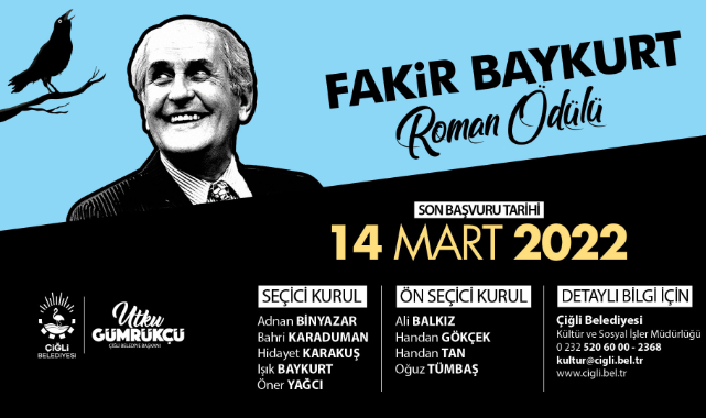 Kültür ve Sosyal İşler Müdürlüğü’nün organize ettiği Fakir Baykurt Roman Ödülü’nün dosya müracaat başvuruları için geri sayım sürüyor. Seçici kurul üyeliğini Adnan Binyazar, Bahri Karaduman, Hidayet Karakuş, Işık Baykurt ve Öner Yağcı’nın yaptığı roman ödülü için başvurular 14 Mart 2022 tarihinde sona erecek. Roman Ödülüne katılmak isteyen vatandaşlar, Kültür ve Sosyal İşler Müdürlüğü’nün 0232 520 60 00 - 2368 numaralı hattından veya [email protected] adresinden katılım şartları ve süreciyle ilgili detaylı bilgi alabilecek.
