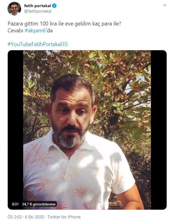 Devletin enflasyonu ile vatandaşın enflasyonunun aynı olmadığı mesajını veren Portakal, "Pazara gittim 100 lira ile eve geldim kaç para ile?" notuyla yaptığı paylaşımında "Yeni bir video geliyor" dedi.