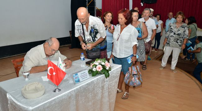 Anadol, Foça Belediyesi’nin etkinliğe katılanlara hediye ettiği kitabını imzaladı.