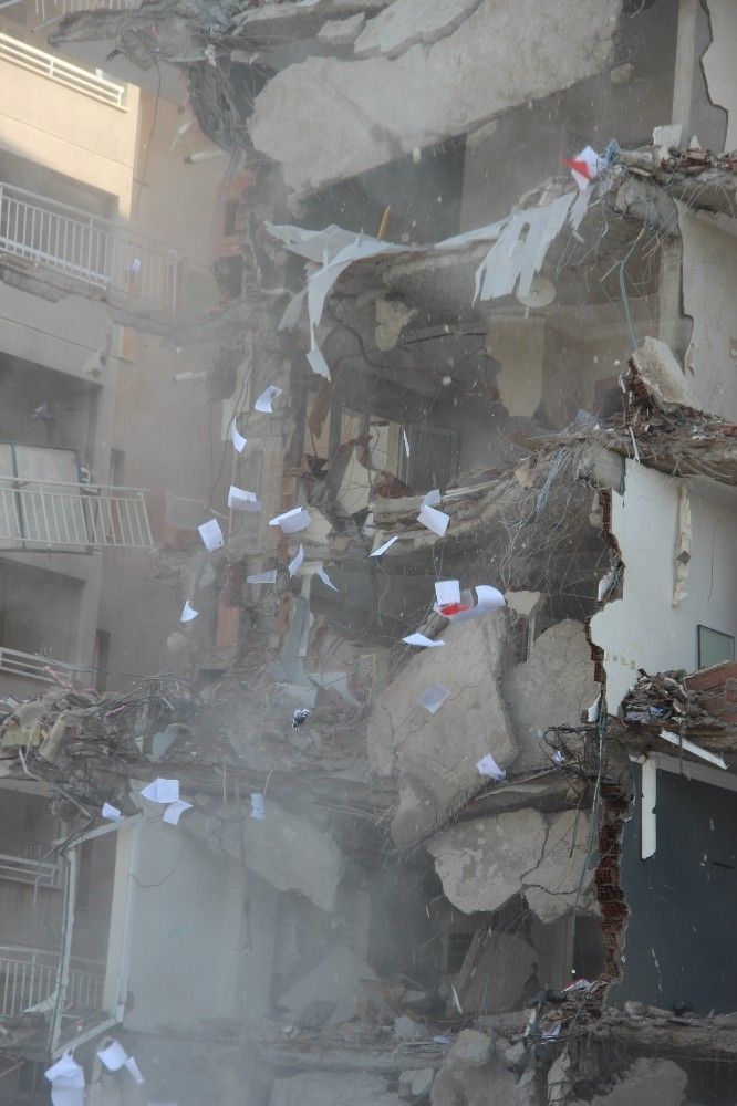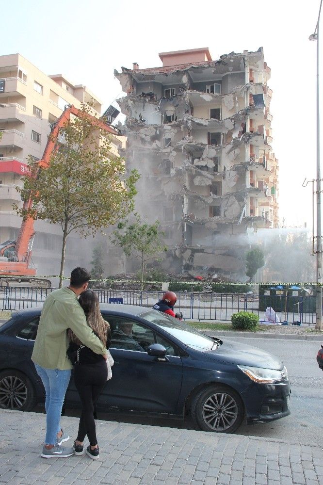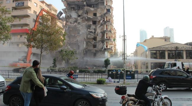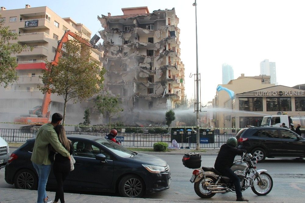 Özellikle Bayraklı ilçesinde kontrollü yıkım çalışmaları sürerken, Cumhuriyet Sitesi'nde bulunan bir binanın yıkım sırasında tamamen çökmesi de kameralara yansıdı.