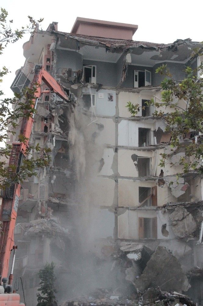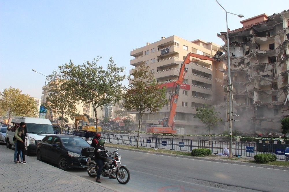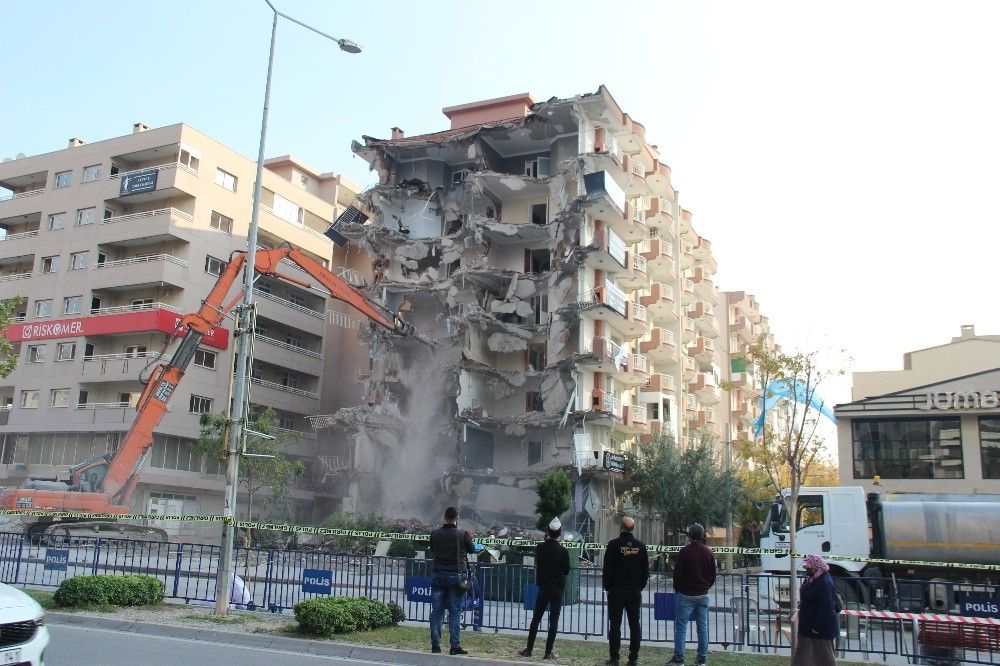 İzmir'deki depremde çok sayıda bina hasar gördü. Hasarlı binaların kontrollü şekilde yıkım işlemleri de devam ediyor. İzmir Bayraklı'daki Haydar Aliyev Caddesi üzerinde bulunan Canbazoğlu Sitesi, iş makineleri ile yıkılıyor.