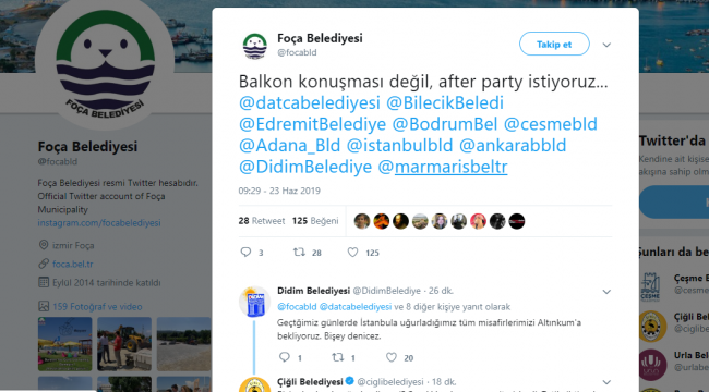 Foça Belediyesi, Twitter hesabından "Balkon konuşması değil, after party istiyoruz..." tweetiyle kutlamaları başlattı. Datça, Bilecik, Edremit, Bodrum, Çeşme, Adana, İstanbul, Ankara, Didim ve Marmaris Belediyeleri de tweete etiketlenirken diğer belediyelerden gelecek kutlama mesajları şimdiden merak konusu.