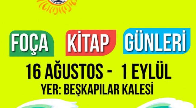 Bu sene ilki gerçekleşecek olan kitap günleri, 16 Ağustos – 1 Eylül tarihleri arasında söyleşiler ve imza günleri ile başlıyor. foça Beşkapılar Kalesi’nde gerçekleşecek söyleşiler ve etkinliklerin yanı sıra birçok yayın evinin kitapları, kitapseverlerle buluşacak. Foça Kitap Günleri’nin açılışı “Foça ve İzmir Kitapları” başlığı altında ‘Babamın Foça’sı’ kitabı yazarı Handan Gökçek, ‘Direnişin adı Gültepe’ kitabının yazarı Murat Şahin ve ‘Güneşin Gizemli Kızı Mordoğan’ kitabının yazarı Cevdet Yüceer ile başlayacak. Program; 16 Ağustos 2019, Cuma - Saat: 20.00Foça ve İzmir Kitapları üzerine söyleşi ve imzaHandan Gökçek - Murat Şahin - Cevdet Yüceer 17 Ağustos 2019, Cumartesi - Saat: 20.00Türk’ün Kadim Vizyonu ve Atatürk söyleşisi ve imzaBaran AydınAtaol Behramoğlu imza günü - Saat: 20.00-21.00 18 Ağustos 2019, Pazar - Saat: 20.00Hüsnü Arkan Söyleşisi ve imza günü 19 Ağustos 2019, Pazartesi - Saat: 20.00Ahmet Önel imza günüHasan Öztoprak imza günü 20 Ağustos 2019, Salı - Saat: 20.00İzmir’in Lezzetleri ve Müzeleri söyleşisi ve imzaNihal Kadıoğlu Çevik ve Ahmet Uhri 21 Ağustos 2019, Çarşamba - Saat: 20.00Ali Lidar ile Küçük Prens üzerine ve Küçük Prens Müzesi hakkında söyleşi ve imza 22 Ağustos 2019, Perşembe - Saat: 20.00Bir Karşı-Distopya olarak Liberhell söyleşisi ve imzaMahmut Eşitmez - Zafer Fehmi Yörük 23 Ağustos 2019, Cuma - Saat: 20.00Babacan Pesenkurdu ile müzik eşliğinde Şiir Dinletisi ve imza 24 Ağustos 2019, Cumartesi - Saat: 20.00Özgürlük ve Edebiyat üzerine söyleşi ve imzaŞükrü Erbaş 25 Ağustos 2019, Pazar - Saat: 20.00Doğa ve Direniş Öyküleri - Kaz Dağları Direnişi Üzerine söyleşi ve imzaÖzer AkdemirFatih Özcan imza günü - Saat: 18.00 26 Ağustos 2019, Pazartesi - Saat: 20.00-Şiirin Uzun Yolunda söyleşisi ve imzaHüseyin Yurttaş