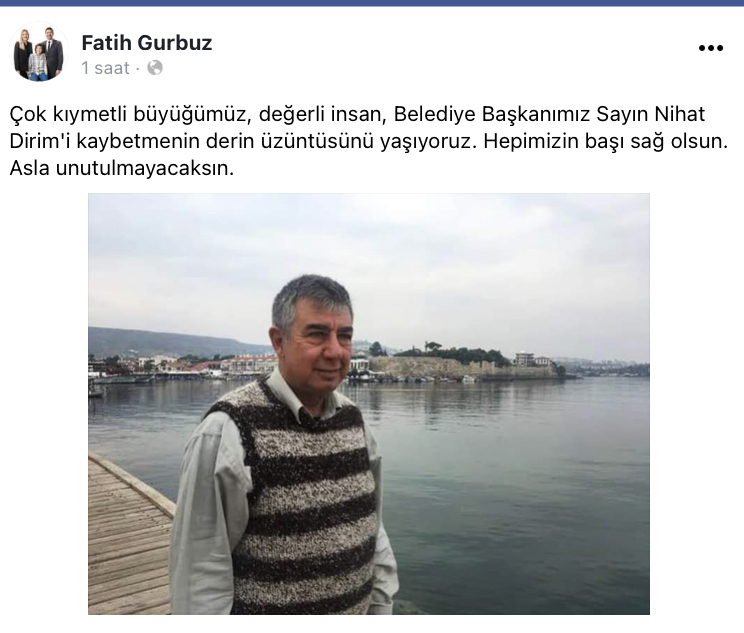 EMEK ÖDÜLÜ VERİLMİŞTİEge Barış ve İletişim Derneğinin hazırladığı "Barış İçin Belediye Buluşmaları Foça Barış Belediyeciliği 1989-1999'' isimli etkinlikte Nihat Dirim'e, Barış Belediyeciliği Emek Ödülü verilmişti. Cenaze programının ise henüz netleşmediği bildirildi.