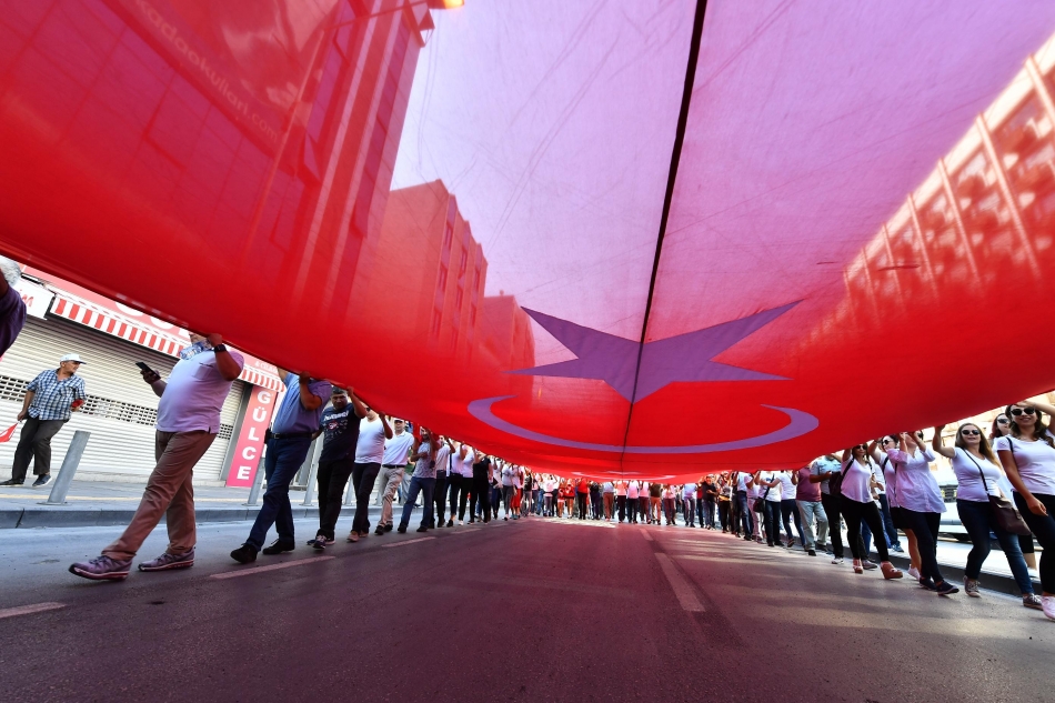 İzmir'in kurtuluşunun 96. yıldönümü kutlamaları yine büyük bir katılım ve coşkuya sahne oluyor. Bu anlamlı günün ilk etkinliği "Zafer Yürüyüşü"ne binlerce İzmirli katıldı. İzmir Büyükşehir Belediyesi'nin hazırladığı 350 metre uzunluğundaki Türk Bayrağı taşıyan İzmirliler, Türk Ordusu’nun 9 Eylül 1922'de kente girdiği güzergâhı kullanarak Basmane Karakolu önünden Cumhuriyet Meydanı'na dek yürüdü.