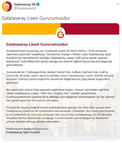 "Kulübümüzün kurucusu ve 1 numaralı üyesi Ali Sami Yen'in 'Türk olmayan takımları yenmek' hedefiyle, Türkiye'nin medar-ı iftiharı olan Galatasaray Spor Kulübü'nün temellerinin atıldığı Galatasaray Lisesi, 1481 yılına kadar uzanan kökleriyle Türk milletinin sahip olduğu en önemli eğitim kurumlarının başında gelmektedir" denen açıklama şöyle devam etti: