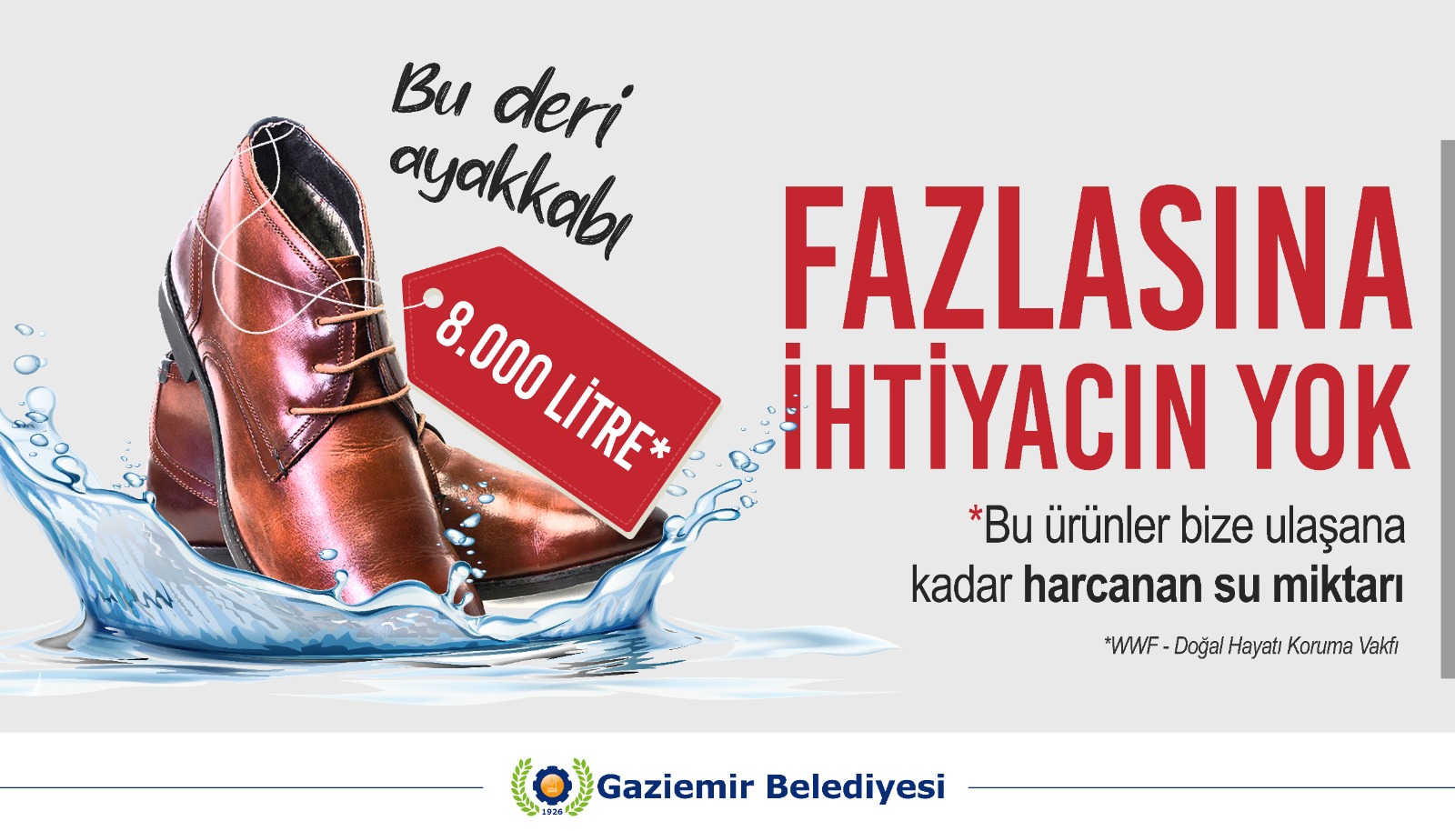 Belediye hazırladığı görsel çalışmayla yiyecek, içecek, ayakkabı ve giysi ürünlerinin üretim sürecinde harcanan su miktarına dikkat çekti. Dünya’nın karşı karşıya kaldığı kuraklık sorununa dikkat çekmek amacıyla hazırlanan çalışmada “Fazlasına ihtiyacın yok” ve “Tüketmeden önce düşün” mesajına yer verildi. Ürünler tüketiciye ulaşana kadar harcanan su miktarının yer aldığı görsel ilçenin dört bir yanındaki ilan panolarına asıldı.