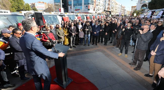 Gaziemir Belediyesi, bir yıllık taşeron ödemesi olan 6,5 milyon lira karşılığında satın aldığı temizlik araçları, düzenlenen törenle hizmete girdi.