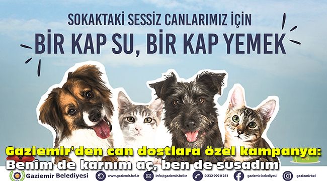 İlan panolarına asılan ve sosyal medya hesaplarından paylaşılan kedi ve köpek fotoğrafları ile ‘Benim de karnım aç,’ ‘Ben de susadım’ ifadelerinin yer aldığı afiş ve görsellerle Gaziemirli yurttaşlara sokaklarına hayvanlar için bir kap mama ve bir kap su bırakmaları çağrısı yapıldı.